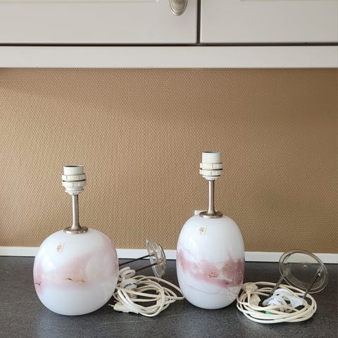 To stk bordlampe, en større og en mindre. Selve lampen fejler intet. Lampeskærmene er også super fine. Dog er der måske en enkelt lys plet hist og her på skærmen. De er begge pakket ned i plast og papkasse, så klar til at blive afhentet