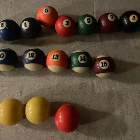 Billard Kugler, 5 kasser med 3 stk i hver = 15 kugler i super fin stand og i super kvalitet. Samlet pris for dem alle kun 1500,-