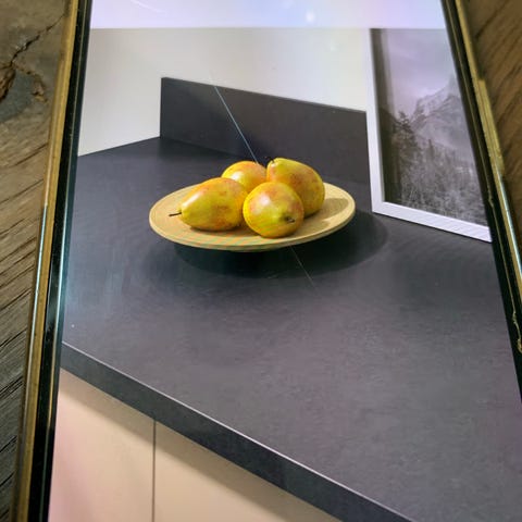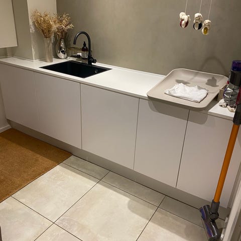Laminat køkkenbord med vask og armatur, samt skabe