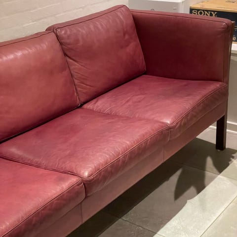 Sofaen har en strømlinet og moderne form, betrukket med blødt læder. Benene er i lys træ.,Afhentes i:,Røde Kors Bellinge (461),Bemærk at mail, chat og beskeder ikke besvares, og varen skal købes på knappen "Gå til varen"