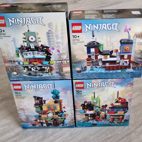 Sælger disse 4 Lego Ninjago Mikro By sæt, som hænger sammen og kan laves til en samlet by.