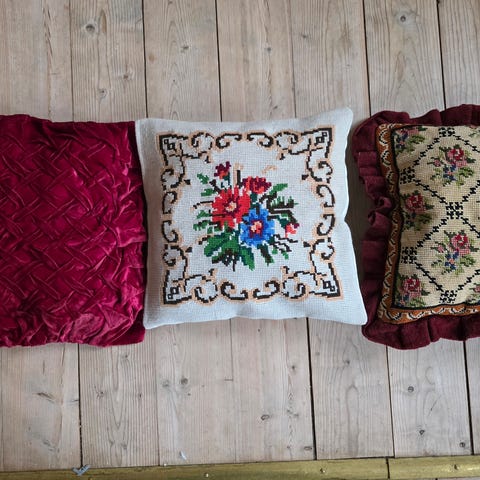sofapude, stramaj, jeg har mange puder ( sofapuder) som er med stramaj og forskellige motiver. Billede 1 + 6 solgt)
