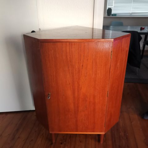 Hjørne skab i teak træ. 141 cm høj og ca 80 cm bred og 50 cm dyb. Sælges uden pynt og indhold