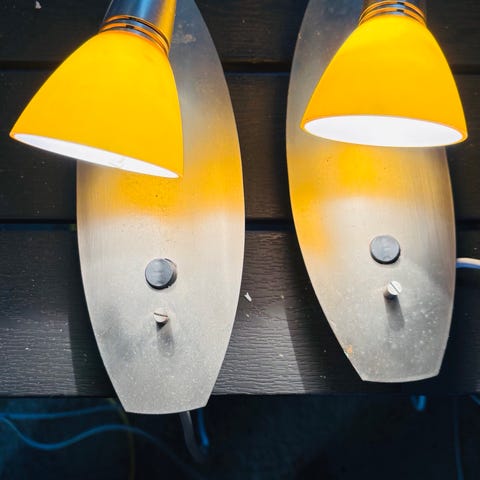 Jeg sælger mine 10 stk. væglamper. Glasskærme som er unikke med aftegninger monteret på forkromet stel. lamperne tager sig virkeligt smukke ud. Kommer med pære samt indbygget lysdæmper. Sælger gerne enkeltvis. Pris per stk.: 300 kr.