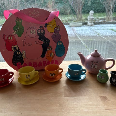 Barbapapa og Hello kitty Børneservice . Melamin . Bestik . Figurer . Glas . Skønne barbapapa og Hello Kitty sager. 2 x melamin skåle plast krus og plast glas , melamin krus og barbapapa bestik 20,- stk Hello Kitty figur og Hello Kitty trolley kuffert som kan åbnes kr 10,- stk . Se flere fotos på annoncen . sender gerne ved min.køb på 50,- eller afhentes I Gilleleje