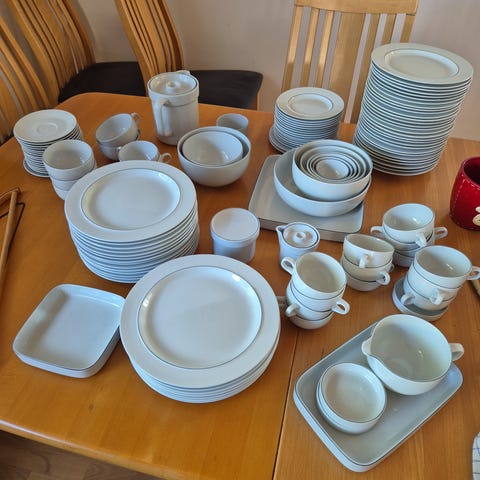 Helt stel med flade spisetallerkner, dybe tallerkner og frokosttallerkner. Samt små flade sidefad. Fremstillet i porcelæn.