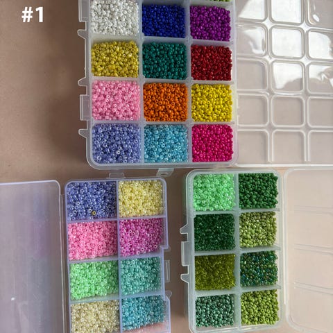 Sæt bestående af forskellige perler og smykkedele i flere farver og materialer, opbevaret i gennemsigtige plastikbokse. Indeholder perler i forskellige størrelser og designs, velegnet til fremstilling af smykker og hobbyprojekter.