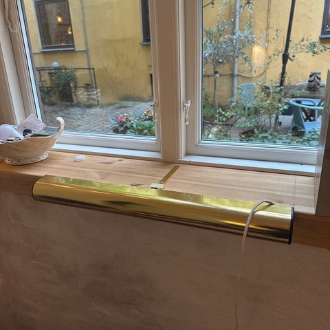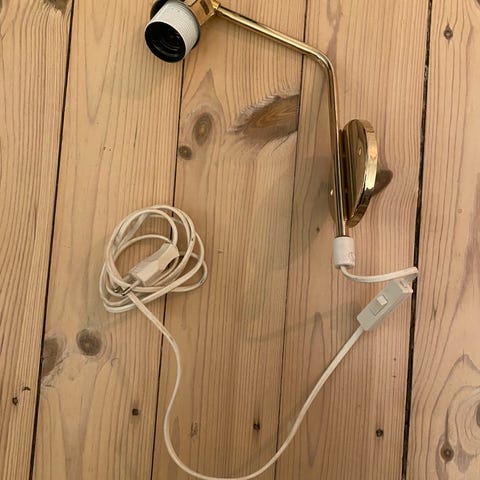 Ældre IKEA lampe af metal/messing/plast til at montere på en reol eller hylde, så den lyser ned på bøgerne. Virker. Har lidt patina. Mål 57 cm