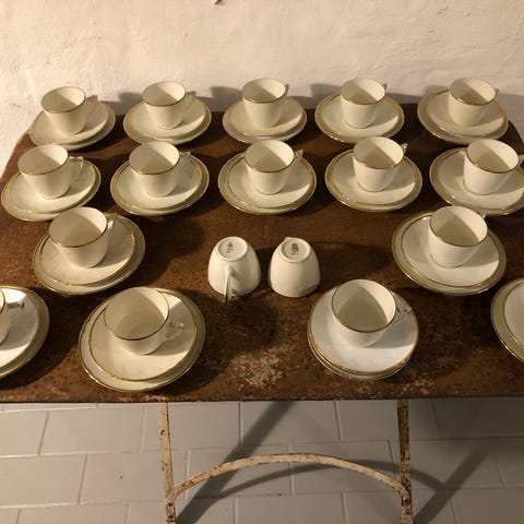 Bing & Grøndahl Åkjær kaffekopper og underkopper i porcelæn. 19 sæt kaffekopper og 1 sæt tekop. Sættet har en cremehvidfarve med guldkant. Materialet er porcelæn med dekorative guldkantdetaljer. Blandet 1. Og 2. Sortering
