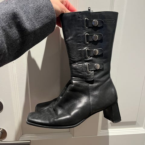 Støvler i størrelse 37 med sort farve og spænde detaljer. Materiale ligner ruskind. Flad sål og lav hæl. Velegnet til daglig brug. Mærket er duffy
