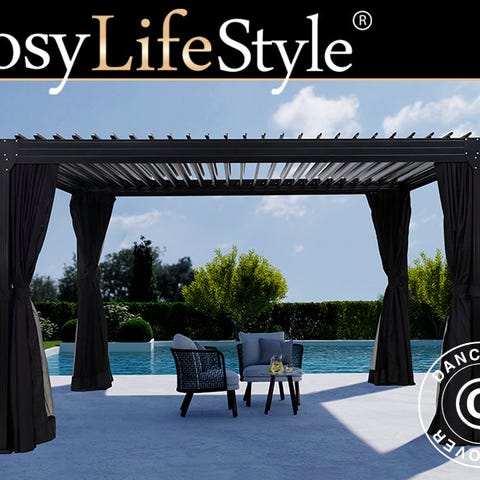 Bioklimatisk pergola pavillon Monterey, 4x8m, m/sidevægge og myggenet, Sort