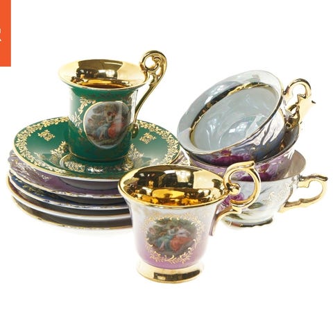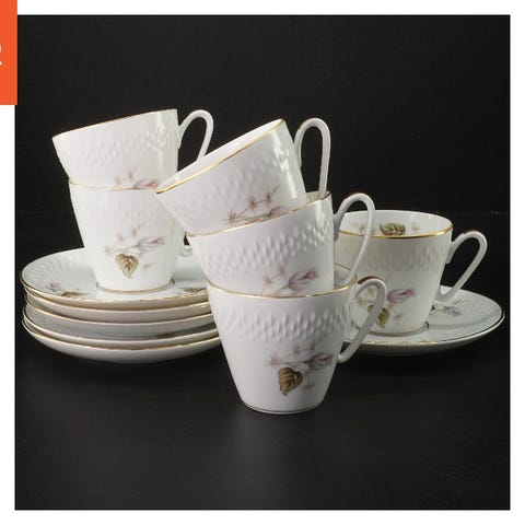 Dette er et sæt af seks porcelænskopper med tilhørende underkopper. Kopperne og underkopperne har en elegant hvid base med fine blomsterdekorationer og guldkant. Størrelserne på kopperne er Ø 7,5 cm og underkopperne Ø 13,5 cm. De er lavet af kvalitetsporcelæn og mærket 'Edelstein Bavaria Germany.' De er ideelle til en stilfuld kop te eller kaffe.