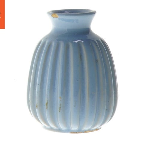 Cylindrisk vase lavet af keramik og måler 17 cm i højden. Vasen har en primær blå farve med en struktureret overflade. Indvendigt og bunden er også blå. Der er en stregkode og et prisskilt i bunden af vasen.