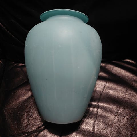 Rigtig fin turkis glasvase. Den er dekorativ og har en form og størrelse så den kan bruges til opbevaring af skriveredskaber, smykker, hjem for en hyacint eller lignende, kun fantasien sætter grænser.