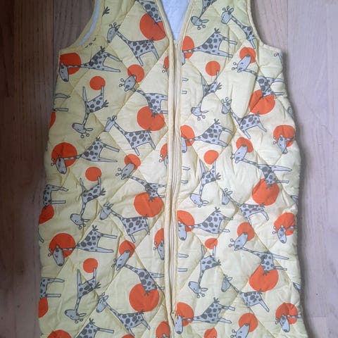 kan bruges som tæppe, åbning til puttepose/ sovepose. Stropper så den også hænges på væg, og ikke fylder så meget.