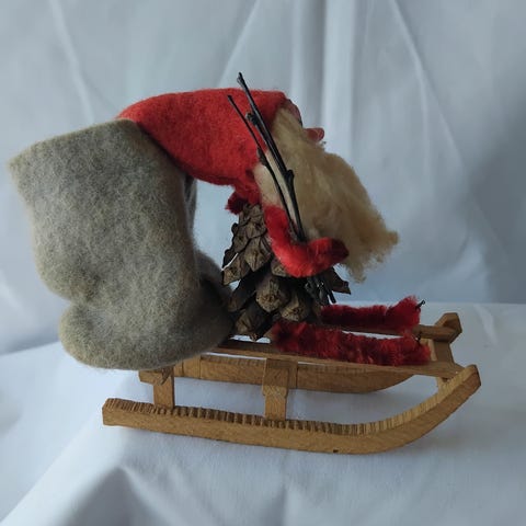 Skøn gammel koglenisse med sæk og med et herligt ansigtsudtryk.