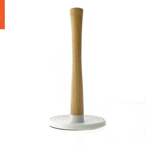 Hånddrejet køkkenrulleholder i hvid olieret træ med sorte detaljer. Ca. 41,5 cm høj og bunden er ca. 15 cm i diameter.