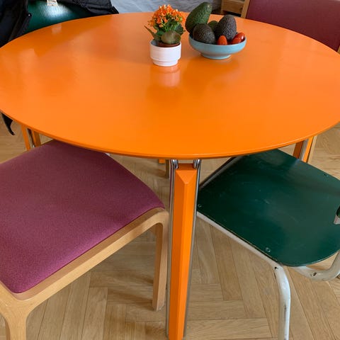 Nymalet rundt spisebord i flot klementin orange farve.