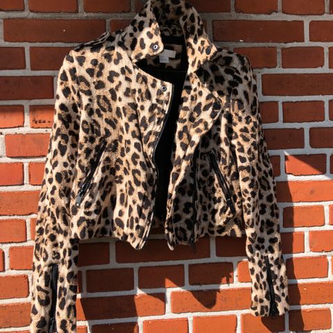 Leopardmønstret kvinde jakke. Foret i nakken er lidt slidt.