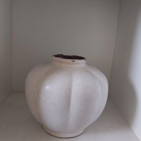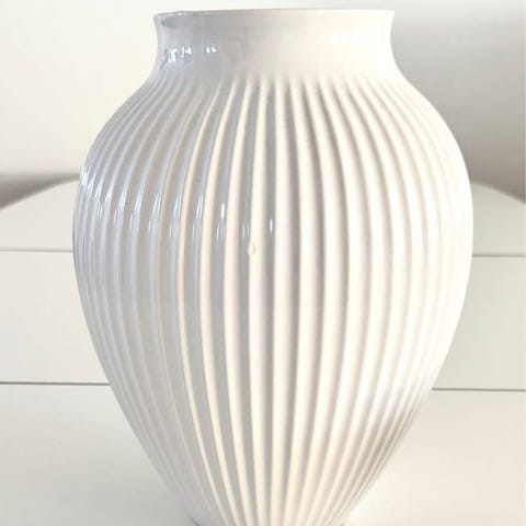 Knapstrup Vase i keramik med Lysegrå farve. Vasen har en karakteristisk rillede overflade og en klassisk form, der passer til forskellige indretningstyper. Velegnet til brug som dekorativ genstand til blomster eller som selvstændigt designobjekt.