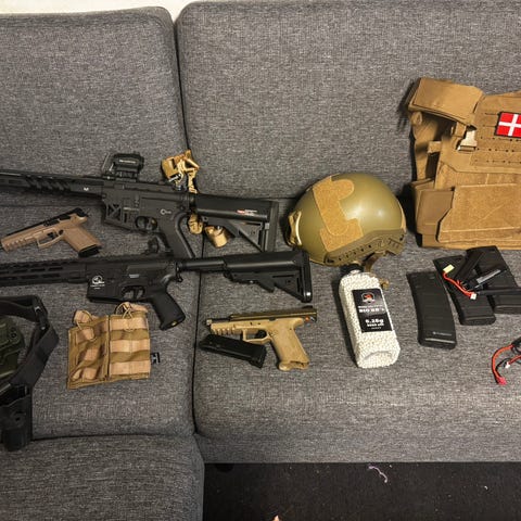 Forskelligt hardball udstyr og våben sælges.