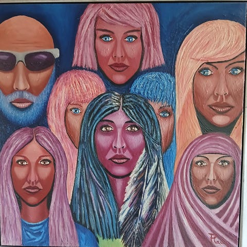 Originalt maleri med abstrakt motiv i farverig komposition. Maleriet indeholder former i nuancer af grøn, blå, pink, rød, orange og lilla. Signeret af kunstneren i nederste højre hjørne. Velegnet til dekoration i hjem eller kontor.