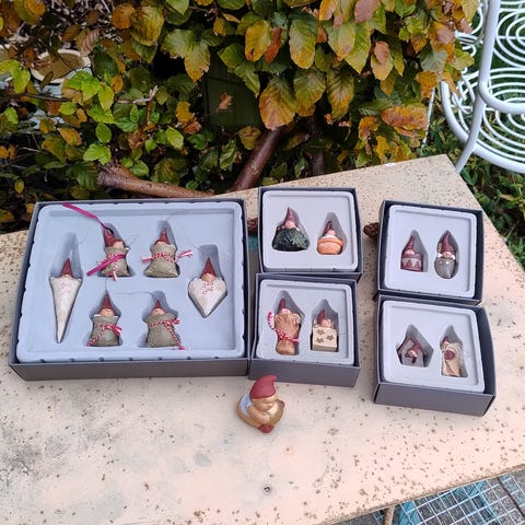 Trip Trap julepynt bestående af 6 nisserikker Både Nisserikker og original æske er i super fin stand. Der er dog slået en lille flig af sækken på Nisserikker nederst til hø.