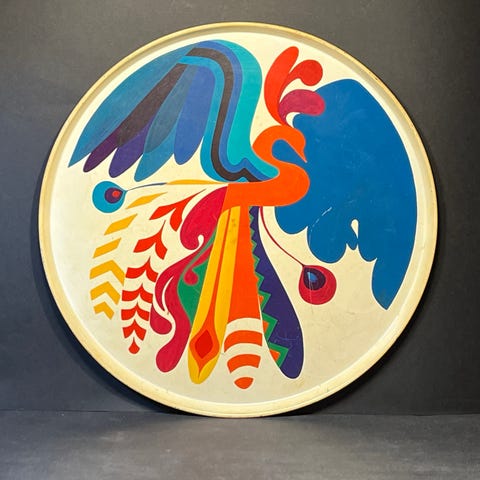 Rigtig flot rund retro 60’er bakke i metal malet lilla blå rød hvid