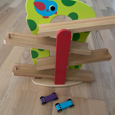 Spire bilbane til små børn. De små biler kører hurtigt ned igennem banen og har masser af leg og underholdning i sig.