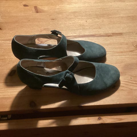 Hallgren sko i størrelse 38 til damer. Skoene er blå og lavet af fint læder. De har en rund spænde detalje over vristen og en lav hæl på 5 cm. Sålene viser tegn på brug, men skoene er velegnede til formelle lejligheder eller festlige begivenheder.