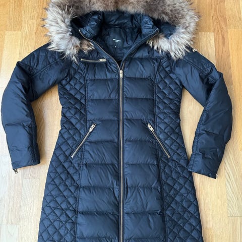 Lang model med quiltet design, stor pelskant på hætten. nyvasket – klar til brug.