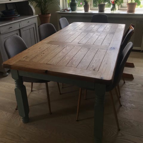 Flot, (og naturligvis brugt) og meget solidt spisebord med et rustikt og varmt udtryk, i fransk landskøkken stil.