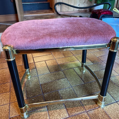 Lille sjov gammel puf, eller fodskammel i træ og rød strik