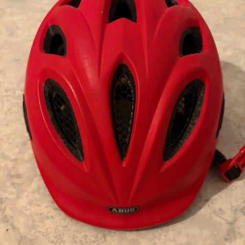 Abus Airbreaker børnehjelm i størrelse 48-54 cm. Hjelmen er pink med hjerteprint og har ventilationshuller for luftcirkulation. Den er designet til børn.