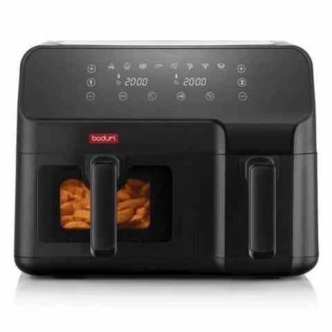 Den smarte 3-i-1 airfryer fra House of Chefs er en genistreg skabt til alle køkkener. Den store airfryer har en samlet kapacitet på hele 11 L i den dobbelte skuffe, hvilket giver mulighed for at lave en stor steg til hele familien. Udskift skuffen med den smarte ovnlåge og pludselig er airfryeren forvandlet til en airfryerovn, der er perfekt til en god kylling eller en kage.