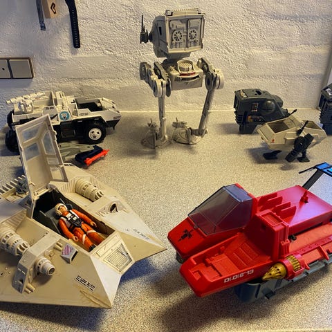 Knæk på den ene darth vaders kappe. Ellers en del figurer i pæn stand. Samt et køretøj og et fly.