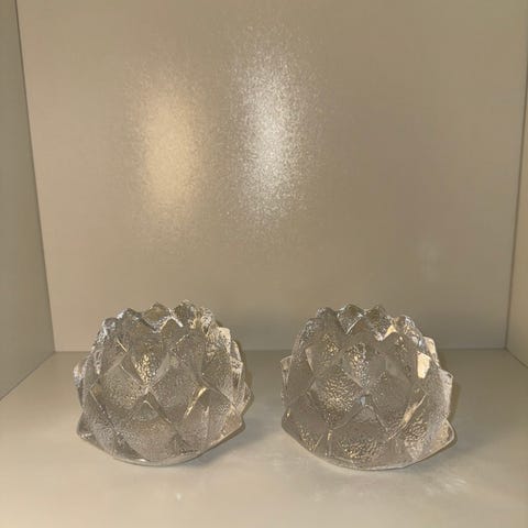 2 fyrfadsstager med navnet Nimbus Artichoke fra Orrefors, som er designet af Berit Johansson mellem 1979-1983. De står i perfekt stand, med originalt mærkat intakt.