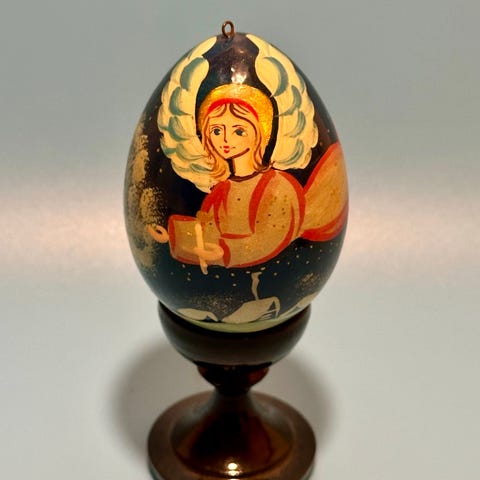 Flot håndmalet russisk pynte æg. I træ. Flotte farver. Motiv- vinter landskab, jule landskab. Det har blandt andet været benyttet både til jul og påske. Alder ukendt. Ved kun det er af ældre dato. H ca 7 cm. Velholdt. Sender gerne til pakkeshop fra kr 44.-