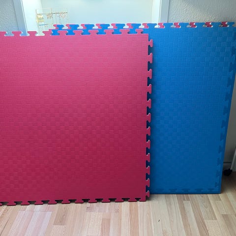 Sælger 2 x 10 m2 Budo-Nord puzzlemåtter (1x1 m, 23 mm tykke) i rød/blå - perfekt til hjemmetræning, leg, yoga, kampsport eller fitness.