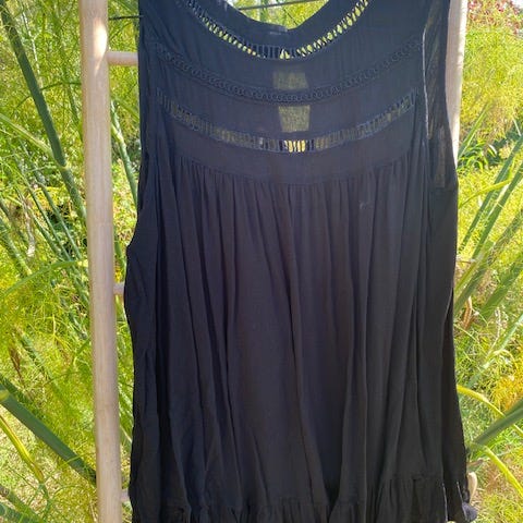 Sort tunika str. M med elastik, så den kan sættes i talje eller på hofte. Sølvfarvede metalnitter pynter udskæringen.