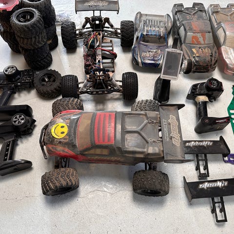 RC biler og en masse tilbehør, dæk, batteri, skjold osv.