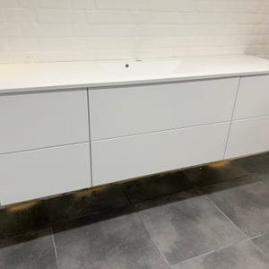 HTH HTH Line badeværelsesskab med integreret vask. Skabet er hvidt med flere skuffer og har en grå bordplade i materiale, der fremstår robust og let at rengøre. Passer til badeværelser og tilbyder opbevaringsplads under vasken.