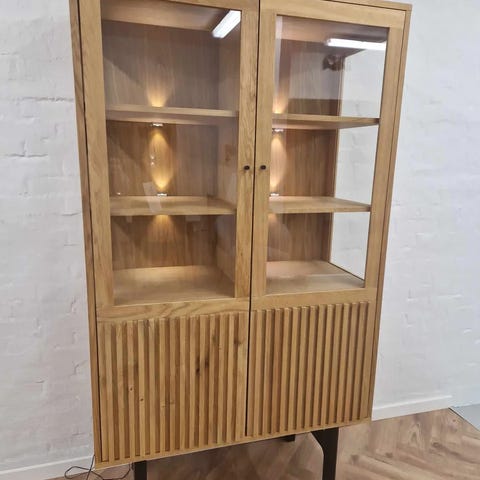 Elegant og stilren vitrineskab i fineret eg med massive ben og rammelåger.