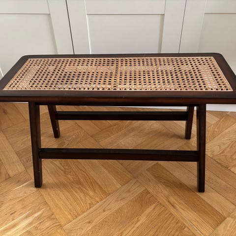 Bænk fra H&M Home i træ og sæde i rotting (fransk flet).
