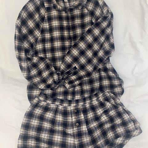 Pyjamas Sæt i størrelse S. Sættet består af en top og shorts med et mønster af kirsebær. Materialet er blødt og egnet til afslapning og søvn.
