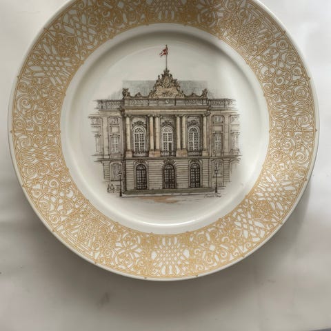 Platter, Mads Stage "Dronningeporten" Port til Kongens Have (bygget i 1913 af Helge Bøjsen-Møller) fra Kgl. Porcelæn fra 1977. Første sortering. Fejlfri da den kun har hængt som vægdekoration. Ophæng medfølger
