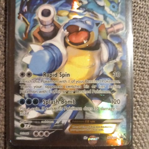 Pokémon Blastoise samlekort fra 1999 med 100 HP. Kortet har synlige brugsspor og let krølning langs kanterne. Kortets dimensioner er standard for Pokémon samlekort. Velegnet til samlere og entusiaster.