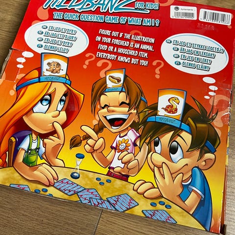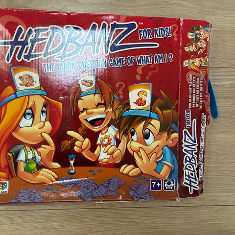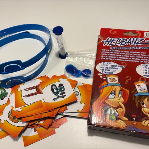 Hedbanz brætspil til familier, inkluderer hovedbånd i forskellige farver og spørgsmålskort.