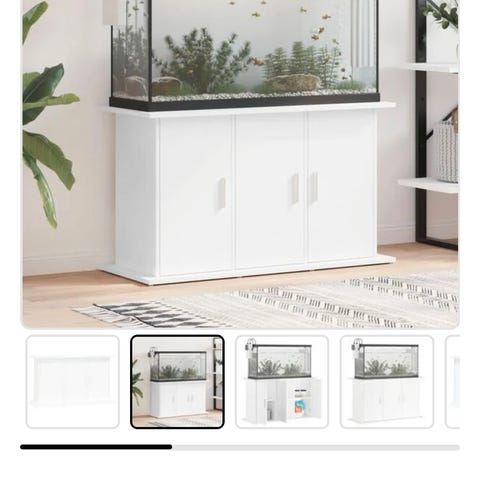 Akvarium med tilhørende hvidt skab med to låger. Indeholder indvendige planter og grusbund. Velegnet til opdræt eller opbevaring af akvatiske dyr. Skabet giver opbevaringsplads under akvariet.ps urte potterne er ikke til salg .500 for det hele