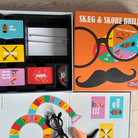 Stoopido brætspil med 1000 sjove ansigter, indeholder flere par røde plastikbriller og forskellige tilbehørsdele til spillet.